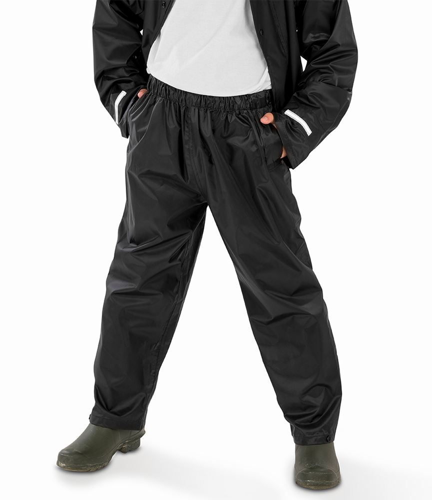 100% polyester with PVC inner coating. Waterproof 2000mm with taped seams. Windproof. Elasticated waistband. Waist vents to access inner pockets. Open leg ends with snap adjusters. Cut out label. Co-ordinates with RS227B.