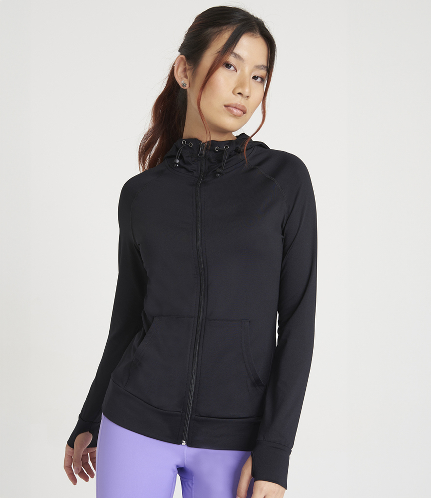 Body 89% polyester/11% elastane. Hood and sleeves 92% polyester/8% elastane. DynamicCool™ responsive blended fabric. Contrast melange effect grown on adjustable hood and raglan sleeves. Taped neck. Full length zip. Front pouch pockets. Thumbholes on cuffs. Tear out label.