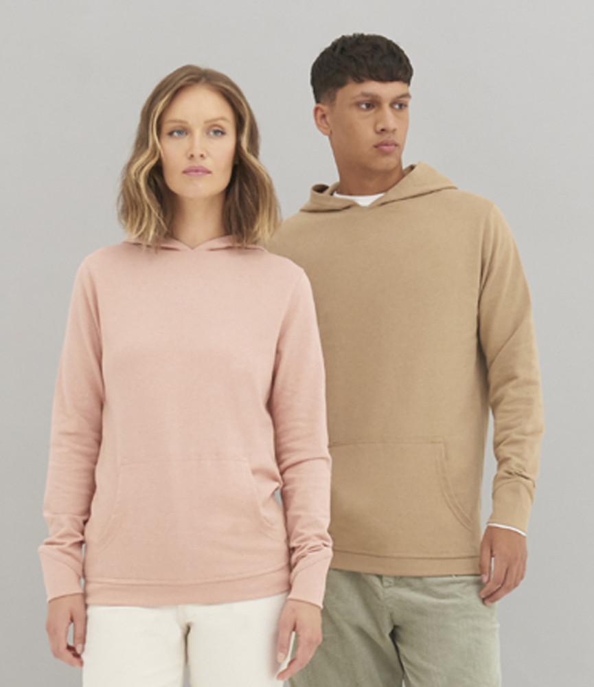 70% recycled cotton/30% recycled polyester. French terry. Drop shoulder style. Fashion fit. Hood with no drawcord. Taped neck. Front pouch pocket. Ribbed angled cuffs and hem. Unbranded size label at neckline. Recycled cotton is made from 100% pre-consumer waste.