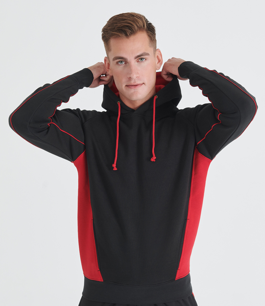 80% cotton/20% polyester. Brushed back fleece. Raglan sleeves. Two panel hood with contrast lining and drawcord. Contrast piping on sleeves. Contrast shaped side panels. Two front pockets. Ribbed cuffs and hem.
