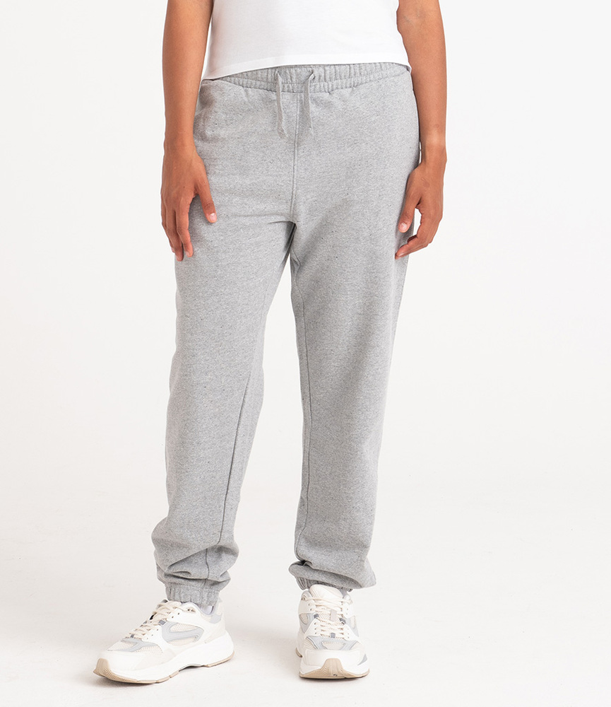 70% recycled cotton/30% recycled polyester. Brushed back fleece. Relaxed fit. Elasticated waistband with drawcord. Two side pockets. Cuffed leg ends. Unbranded size label. Recycled cotton is made from 100% pre-consumer waste.